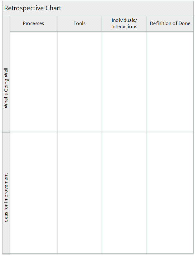 这种方法鼓励团队成员进行更广泛的思考。要求团队成员在流程、工具、个人/互动和“完成的定义”方面找出进展顺利的地方和需要改进的想法。然后,要求团队成员投票决定在即将到来的Sprint中重点关注哪些改进意见。