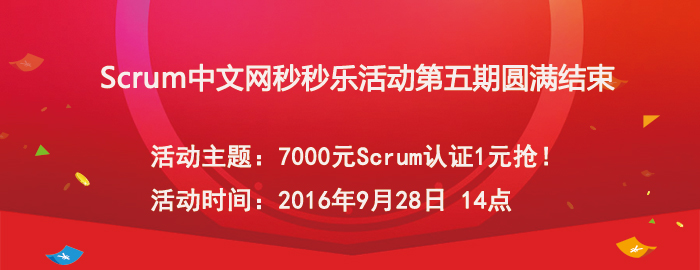 2016年9月28日Scrum中文网在微信公众平台举行了第五期Scrum秒秒乐活动。Scrum中文网秒秒乐活动旨在回馈长期以来支持Scrum中文网的会员,并吸引更多的人参与到敏捷中来。