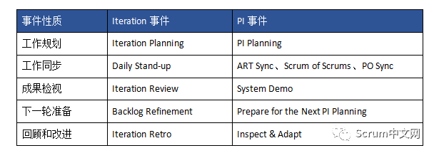 我们可以把PI事件与敏捷迭代事件做一个对比,具体见表1。