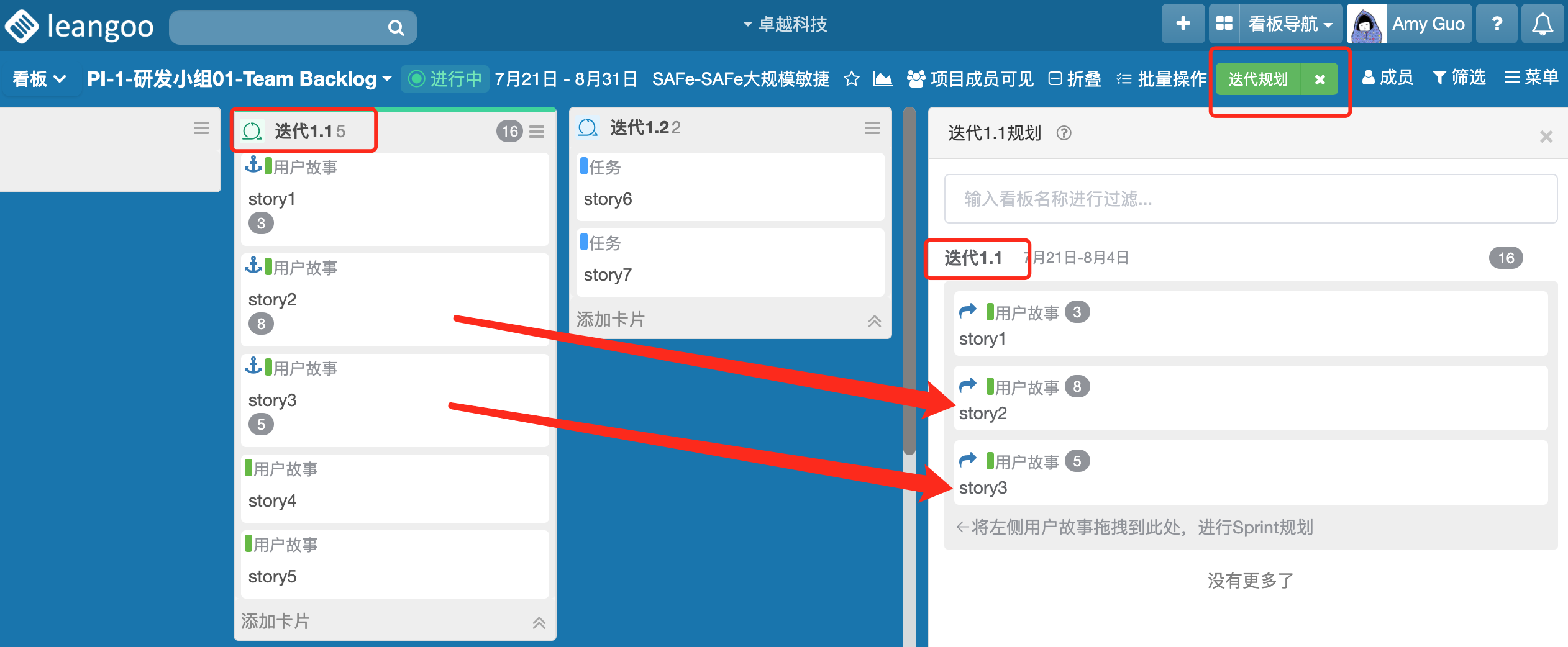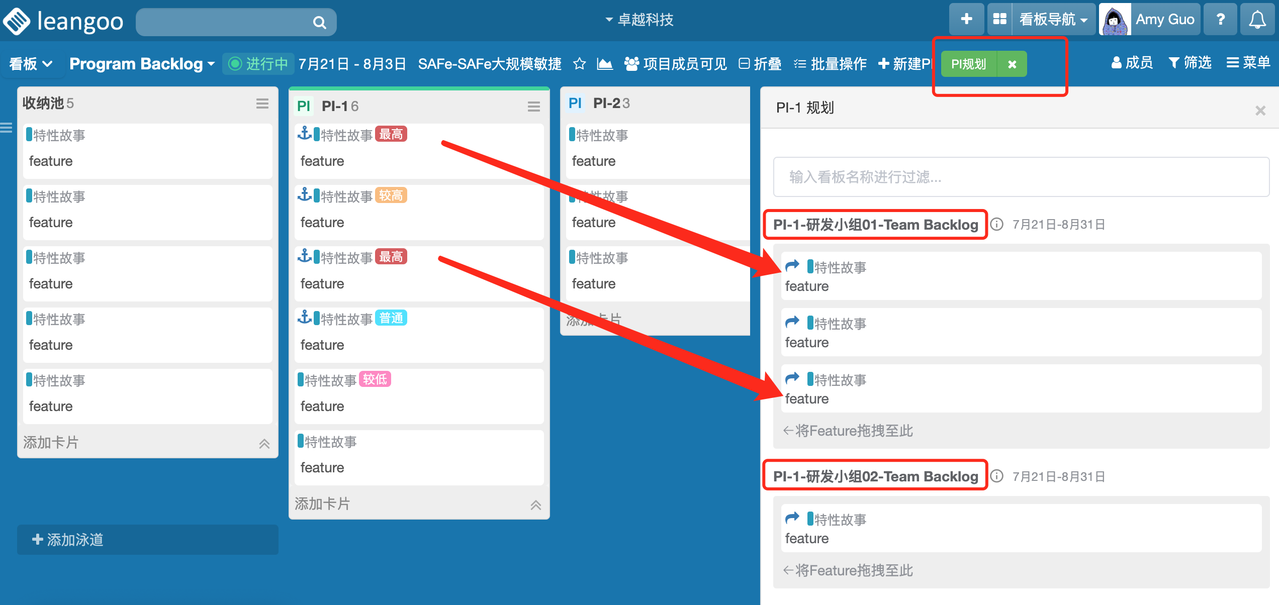 点击 “PI规划” 按钮,看板右侧会出现该 PI 对应的所有 Team Backlog,拖动PI列中的特性故事到 Team Backlog,完成操作后,特性故事会引用到该 Team Backlog 看板。