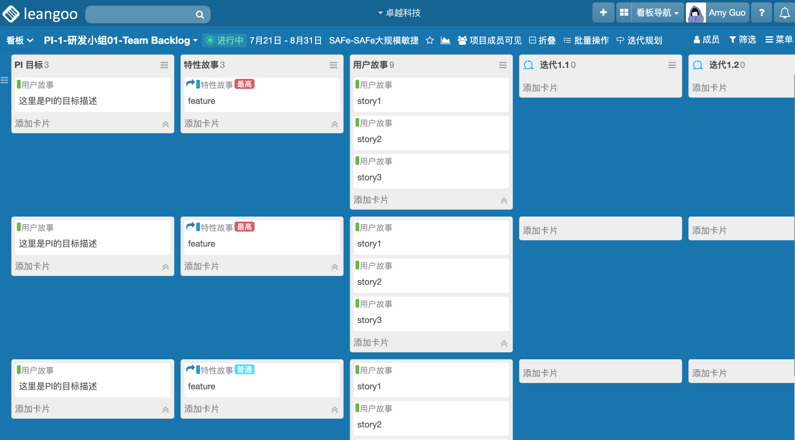 在Program Backlog看板里,我们可以添加多个PI,(每个列表代表一个PI)以及在PI里需要完成的特性故事。