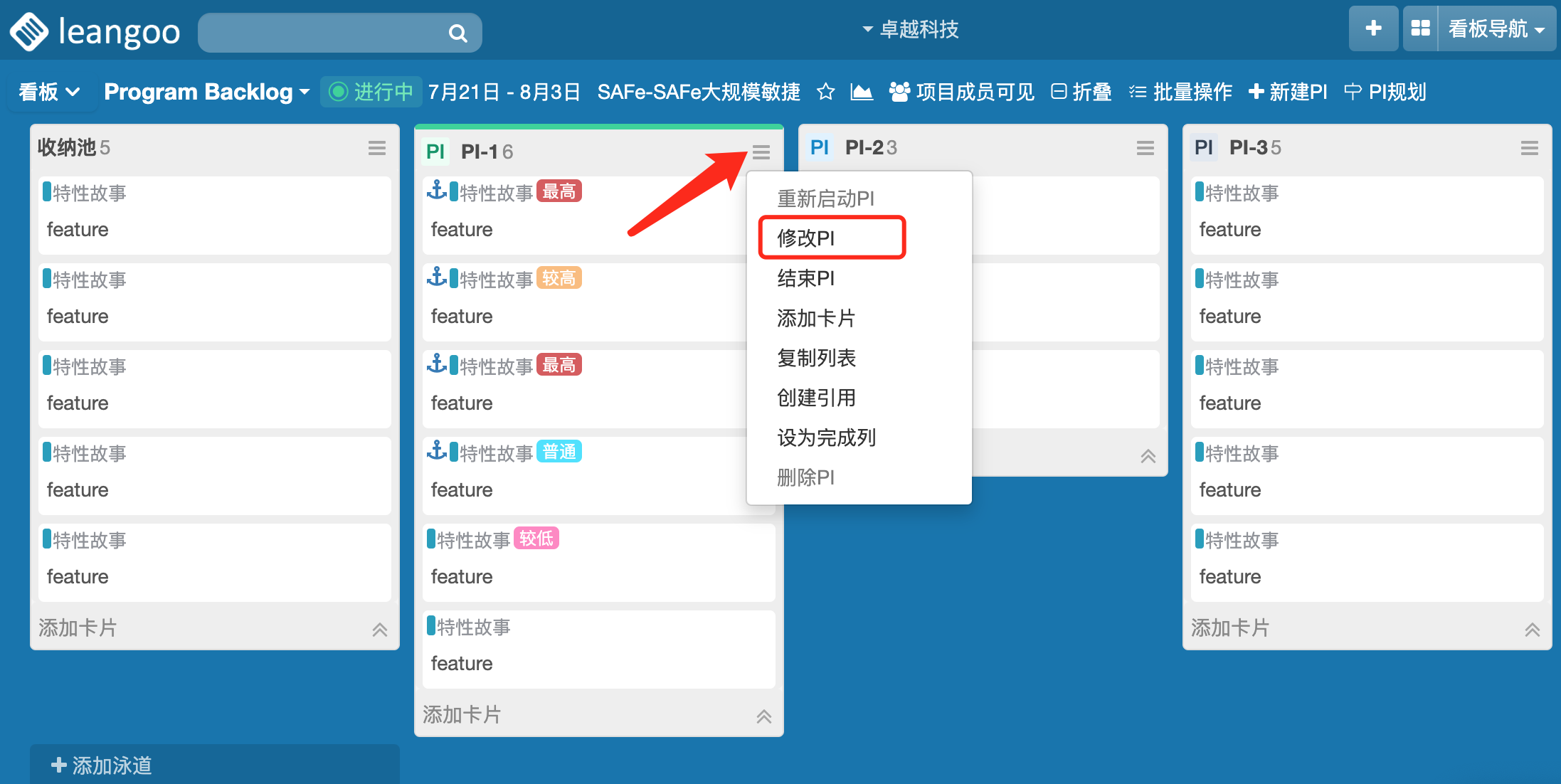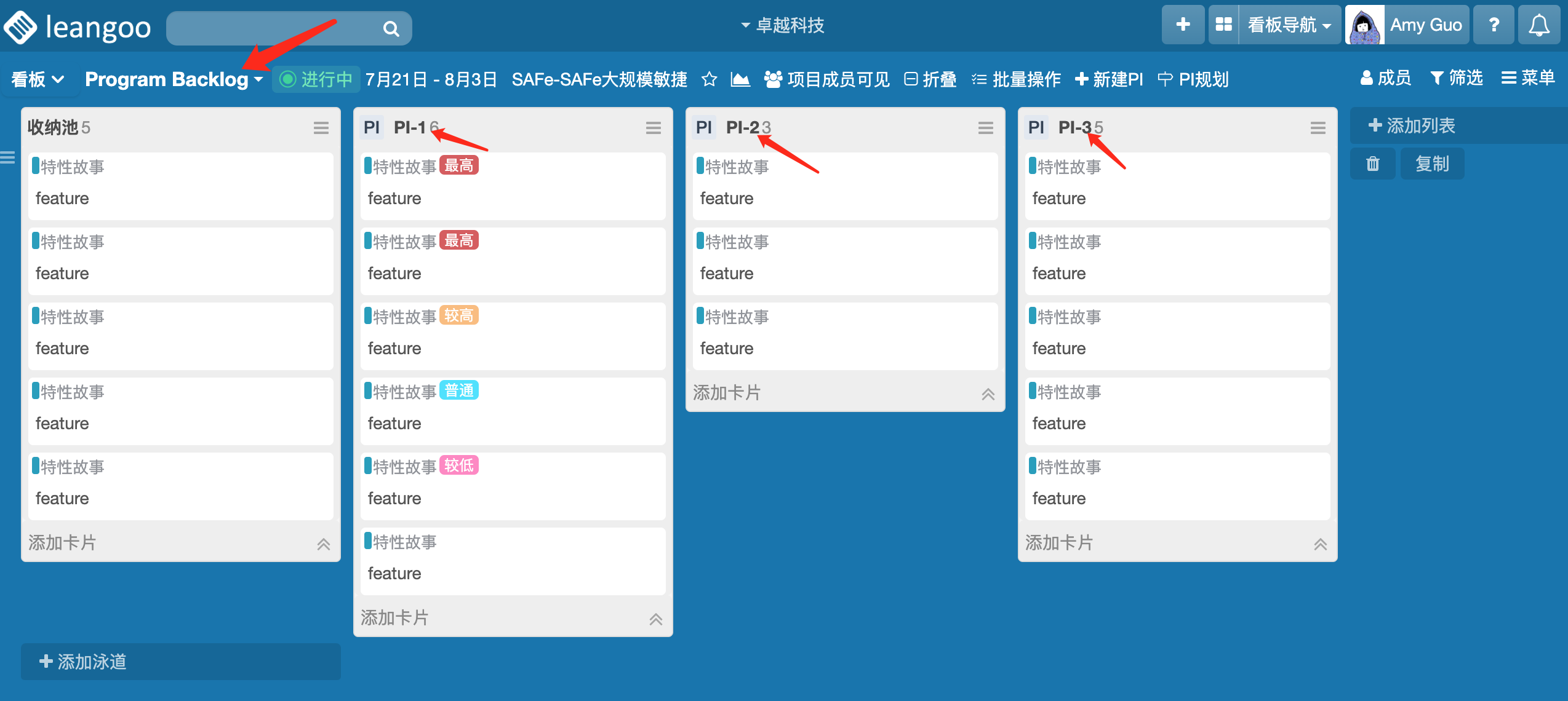优先级高的特性故事放到较前的PI内,在PI内需要优先做的放到靠上位置,或者用标签标记每个特性故事的优先级。