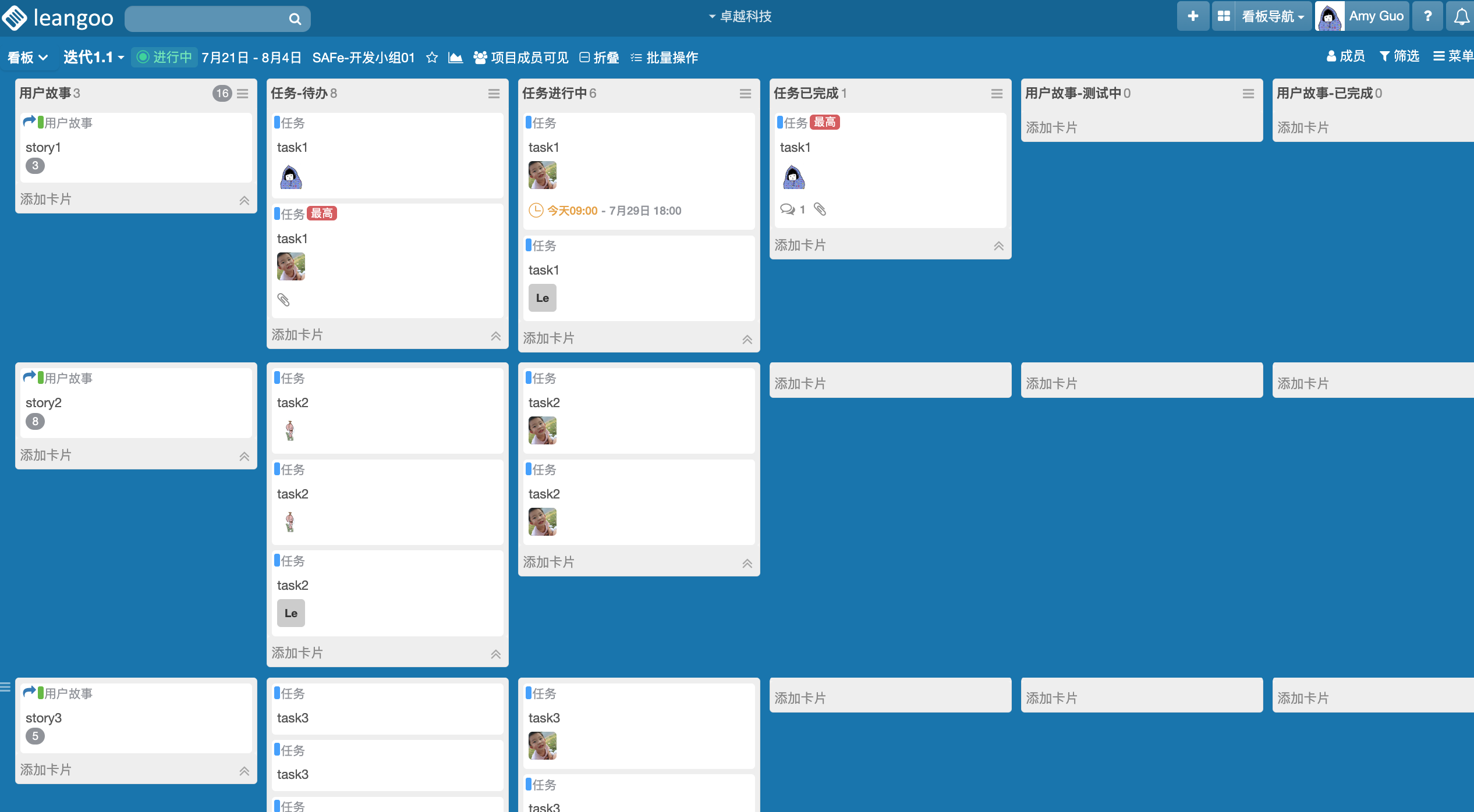 迭代启动后,进入迭代看板,可以看到引用的用户故事已分别放置在独立泳道中,泳道可横向对应用户故事和拆分的任务。