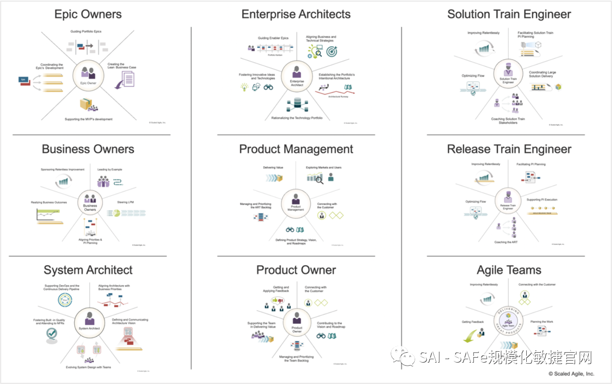 SAFe实施咨询顾问(SPCs)–以前被称为SAFe项目实施顾问,SPCs为SAFe实施路线图中描述的许多实践和关键动作提供辅导。他们还必须在路线图之外,作为一群具有不懈精力的变革推动者,通过执行图9中的责任领域,逐渐为组织带来业务敏捷性。