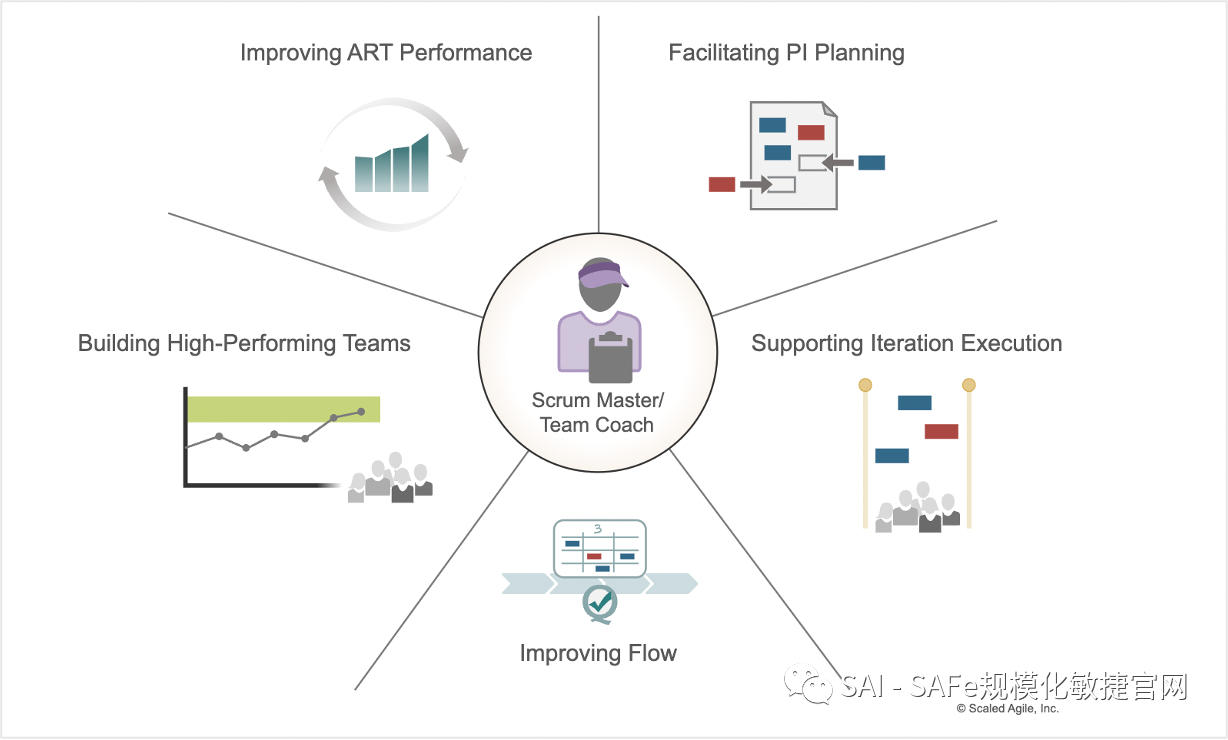 Scrum Master/团队教练 – 在SAFe6.0 中要求在优化流动、建立高绩效团队和支持组织敏捷性方面有更广泛的责任(图11)。组织可以选择Scrum Master或团队教练的角色名称,以最适合他们的情况为准。