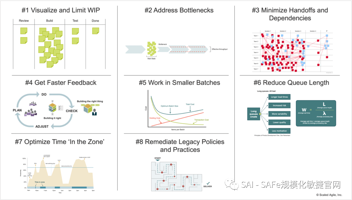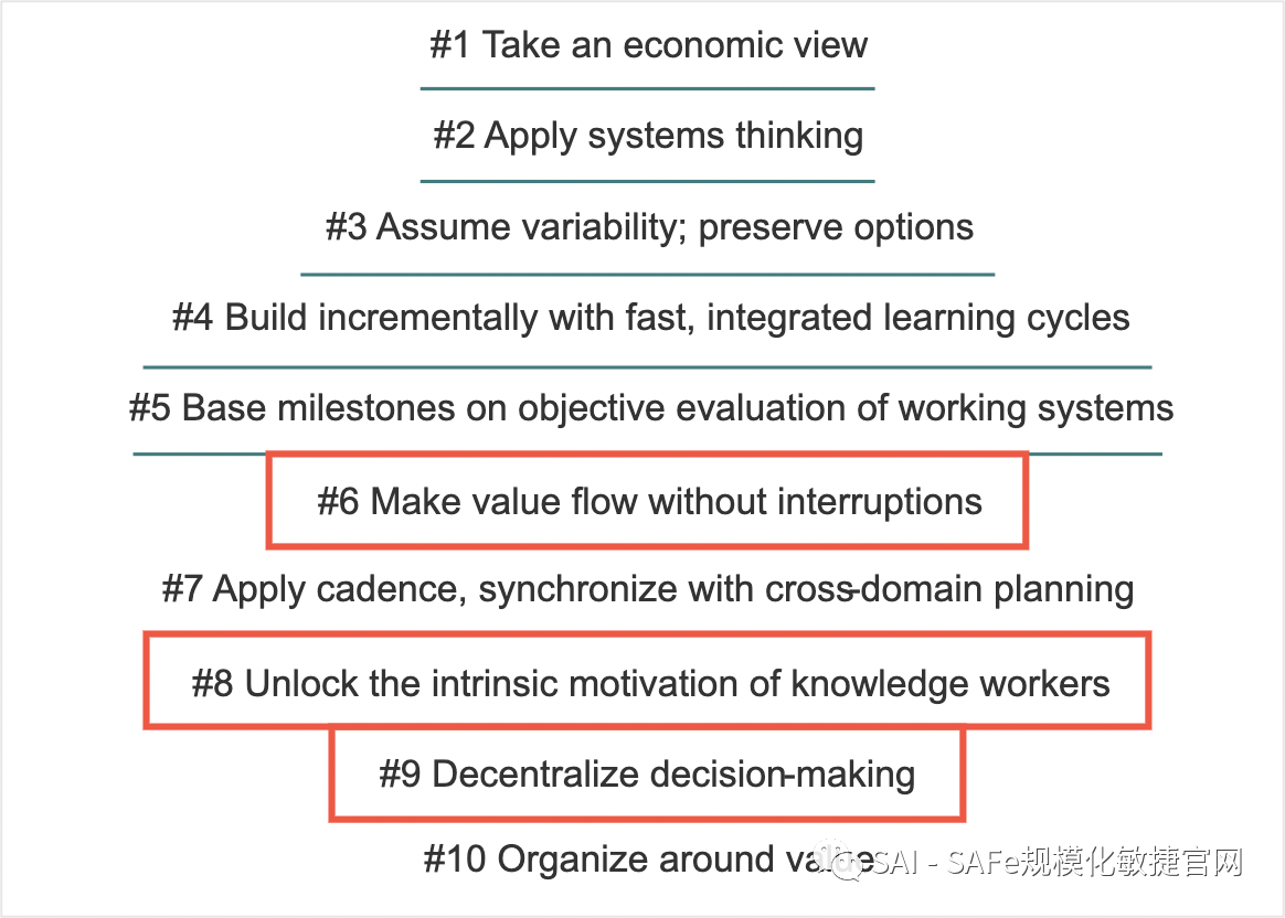 SAFe原则–修改了原则#6,使之与精益思想的五个原则相一致(图7)。还强调了基于流动的系统的八个共同因素,并提供了消除流程障碍的具体加速器。此外,原则6和原则8根据我们最新的思维模式进行了重构,对原则9进行了完善,以更好地描述何时以及如何进行去中心化决策。