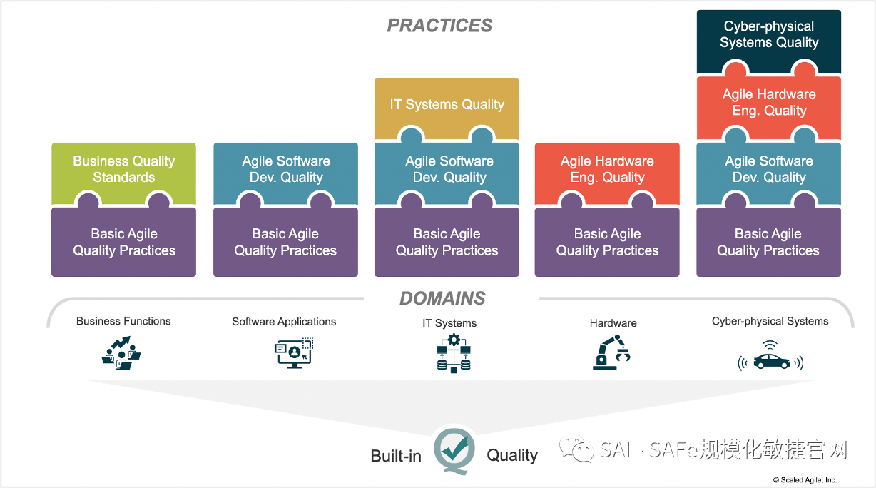 内建质量 – SAFe 6.0提供了一种新的创新方法,在所有的技术和业务领域中实现内建质量,如图19所示。这个模型从普遍适用的基本敏捷质量实践开始。这些实践包括学习左移、结对和同行评审、集体所有权、T型技能、完成的标准,以及工作流程自动化。该模型在此基础上建立了适用于特定领域的质量实践,如业务功能、软件应用、IT系统、硬件和网络物理系统。