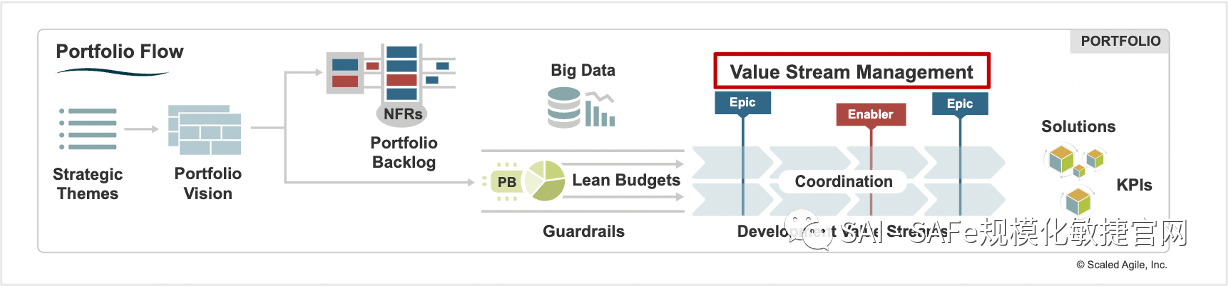 大数据–SAFe解决了投资组合层面的大数据问题,因为组织中最高层需要确立愿景、投资和进行组织治理。敏捷发布火车(ARTs)创造了数据,其价值来自于投资组合和企业的数据汇总。大数据要求组织对最重要的部分进行战略投资,并采取全面妥善的方法,将组织的每个开发价值流与相同的数据运营实践相协调,使整个组织可以使用一致的数据集。