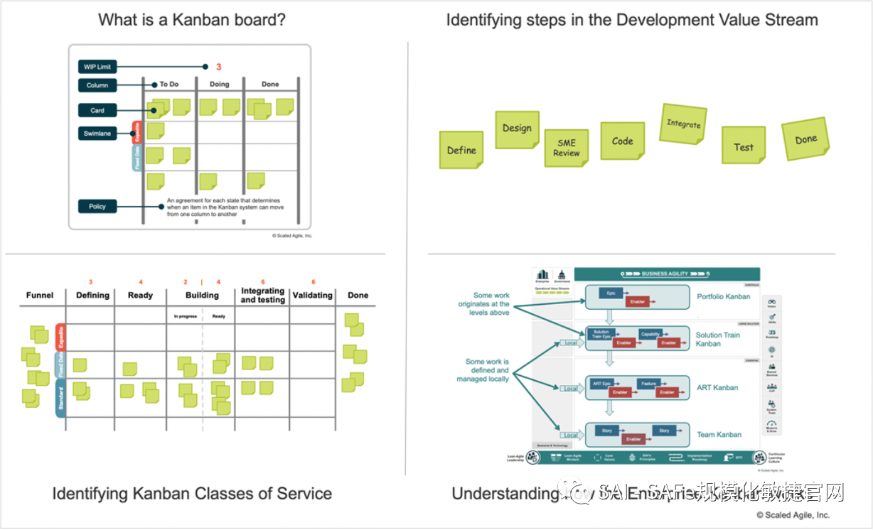 SAFe团队看板是一种精益敏捷方法(图17),它通过可视化工作流程、建立在制品(WIP)限制、持续交付价值、度量吞吐量和改善流程,帮助敏捷团队促进价值流动。这篇文章已经从Kanban改名为 “SAFe团队看板”,并做了重大修改,以解释作为ART一部分的SAFe团队如何使用看板。