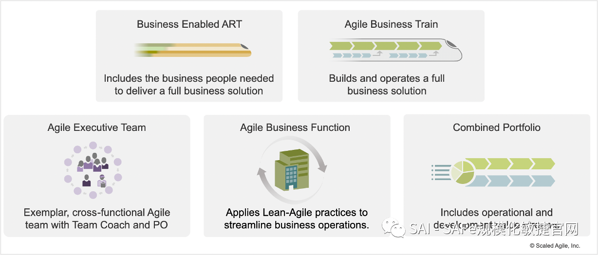 业务支持的ART–包括所需的技术和业务人员,以确保解决方案了解其所在的行业,并解决技术、业务和客户的相关问题 敏捷业务火车是向敏捷性迈出的又一步。敏捷业务火车包含一个或多个SAFe运营价值流,以及定义、构建、部署、运营和商业化一个完整的商业解决方案所需的所有ARTs 敏捷高管团队 – 敏捷执行团队将整个组织的高级领导层统一起来,作为一个团队来运作公司,以一个声音来沟通战略和愿景,并对战略工作进展进行调整 敏捷职能部门 – 敏捷职能部门是一个组织单位,利用精益敏捷方法和SAFe原则来简化其运作,并在其价值交付中创造透明度 联合的投资组合 – 它是一种SAFe组合,包括开发和运营价值流。联合的投资组合提供了明确的战略资金决策,并在业务领域内对一套混合的解决方案进行调整