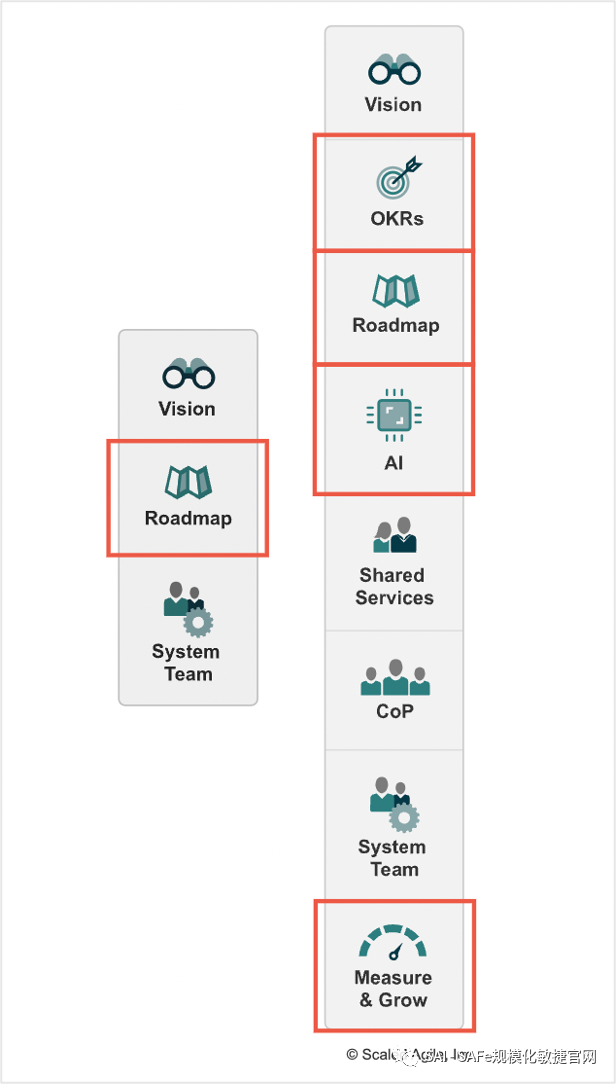 SAFe基石–图4中图标所示的所有文章都得到了增强,以进一步加强对业务敏捷性的支持,同时还进行了以下设计变更。
