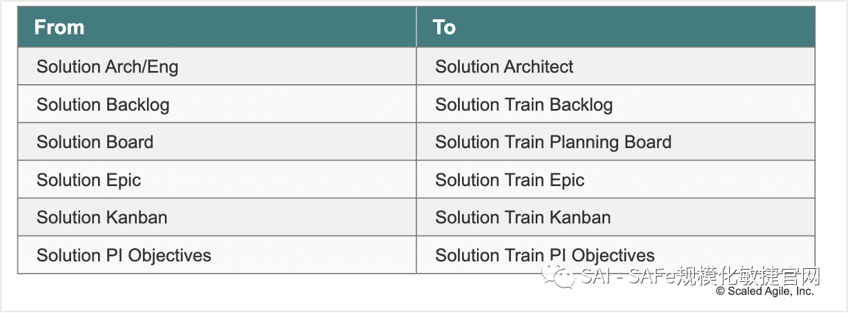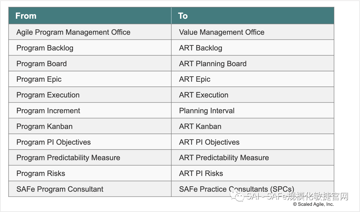 将 敏捷发布火车(ART) 术语标准化–在整个框架中用敏捷发布火车(ART) 取代了Program的术语。将这一术语标准化,可以实现简单性和提高清晰性。
