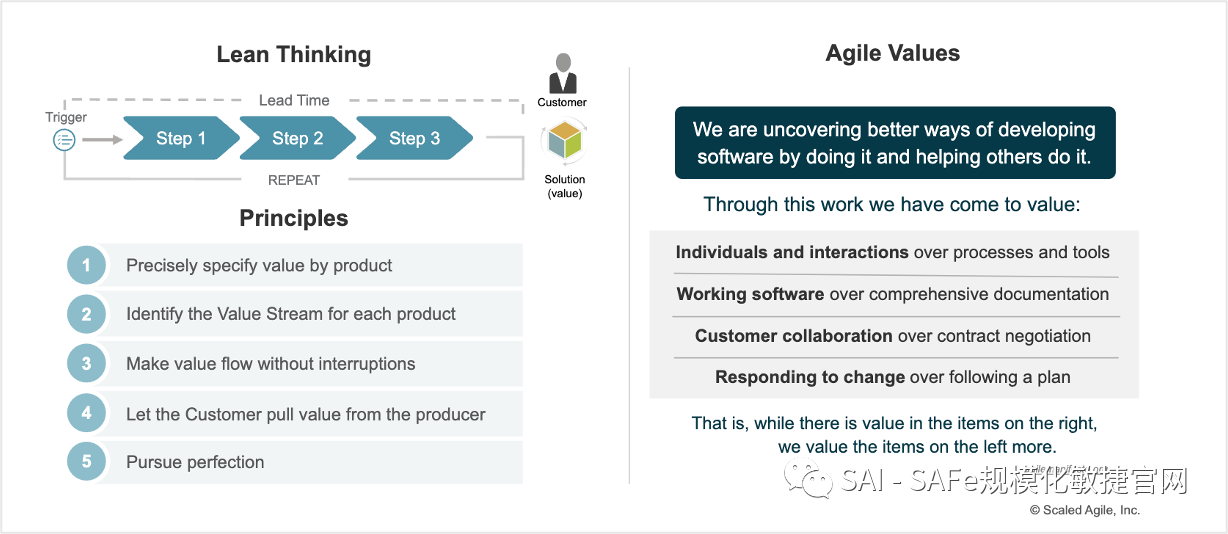 精益敏捷思维模式(Lean-Agile Mindset) – 精益敏捷思维模式是由精益思想(Lean Thinking)和敏捷宣言(Agile Manifesto)的五个原则所组成(图5)