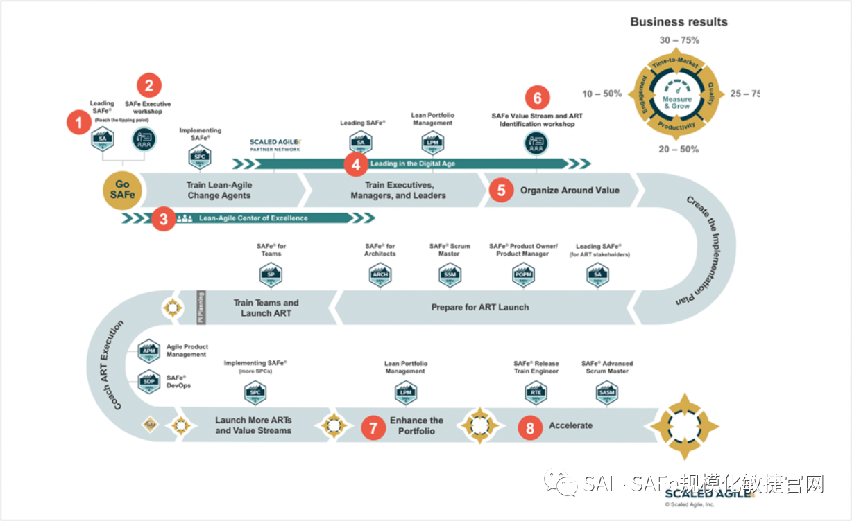 SAFe实施路线图–SAFe实施路线图提供了使用该框架的关键步骤,已经更新以反映SAFe 6.0的变化(图8)。
