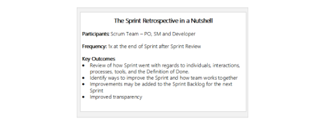当采用Scrum框架时,回顾会(Retrospective)是Sprint中的最后一项活动。通过Sprint回顾,团队可以确定如何更好的协作并提高产品质量。Sprint评审会是团队检视产品增量的机会,而Sprint回顾会则是团队检视自身的机会。在回顾会中,团队共同讨论在这个迭代中,个人、互动、流程、工具和“完成定义”(Definition of Done, DoD)方面的表现。