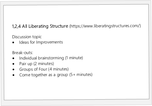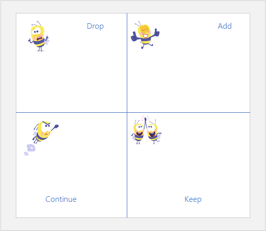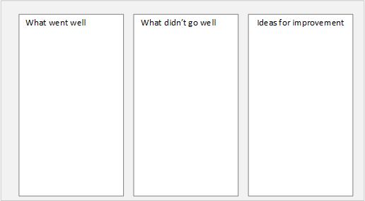 这种方法鼓励团队成员进行更广泛的思考。要求团队成员在流程、工具、个人/互动和“完成的定义”方面找出进展顺利的地方和需要改进的想法。然后,要求团队成员投票决定在即将到来的Sprint中重点关注哪些改进意见。
