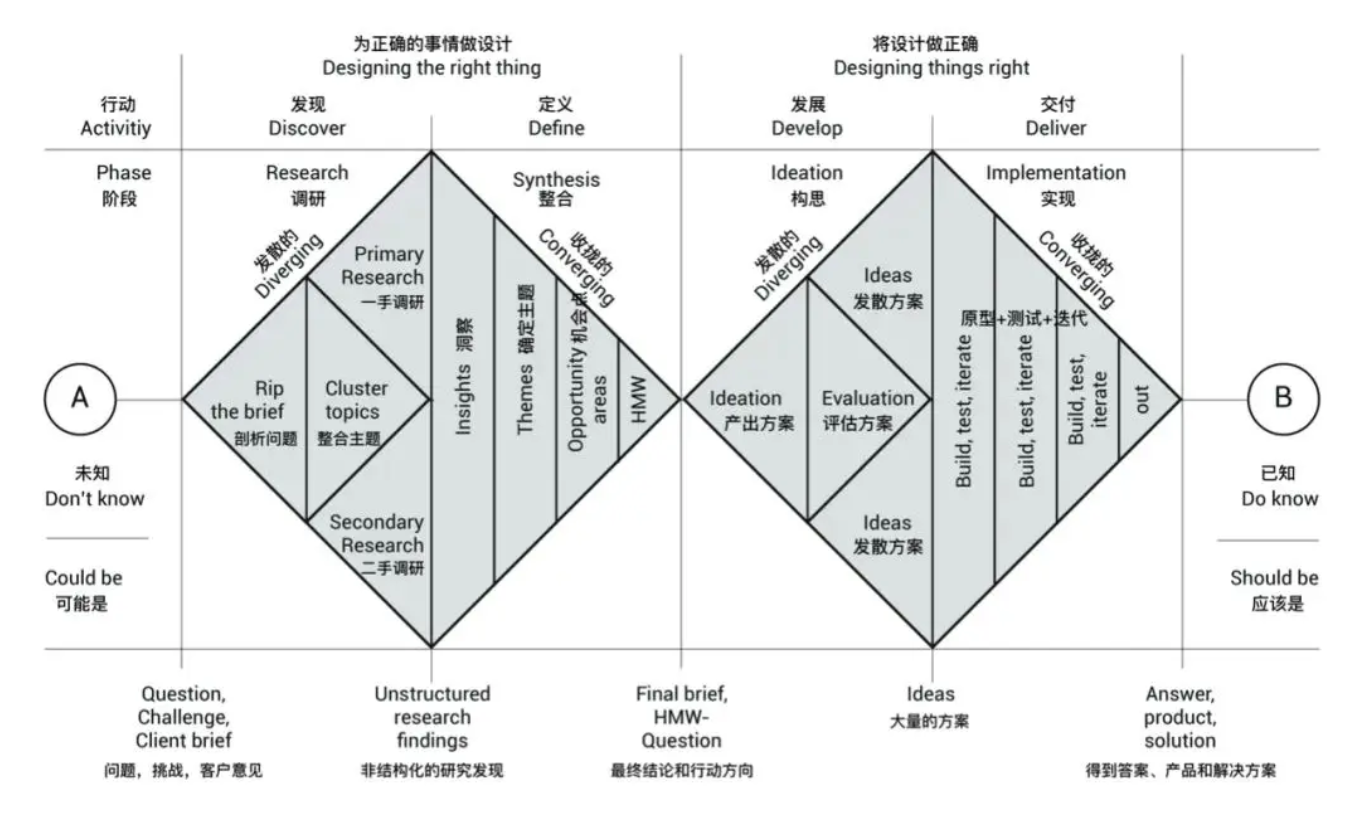 双钻模型是一种结构化的设计方法,将整个设计过程分为两个大的阶段(即图中的菱形钻石):