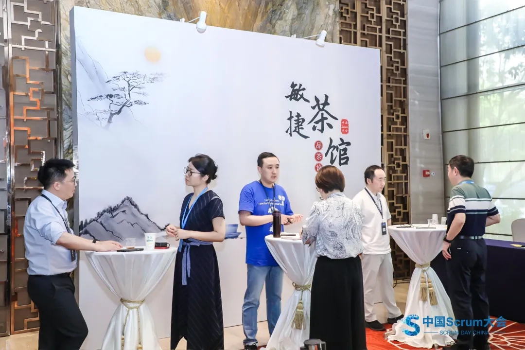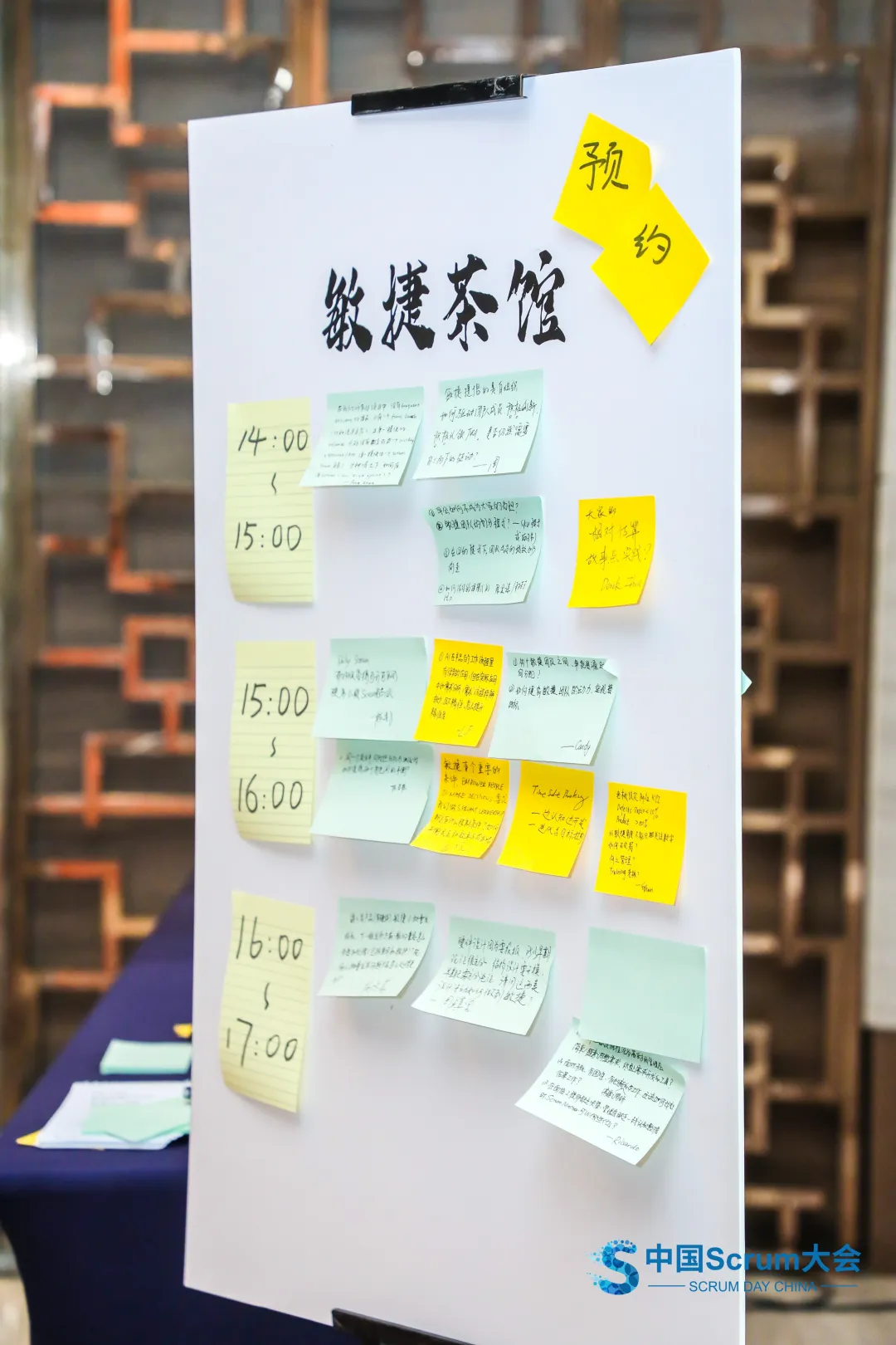 「敏捷茶馆」是这次大会的亮点,各位资深敏捷教练,顾问和PST们在这里和参会者小伙伴进行一对一的交流,预约栏迅速被大家的问题填满。现场洋溢着积极的讨论声和欢快的笑声,各种敏捷实践的交流与碰撞让整个环境充满了活力与求知的氛围。