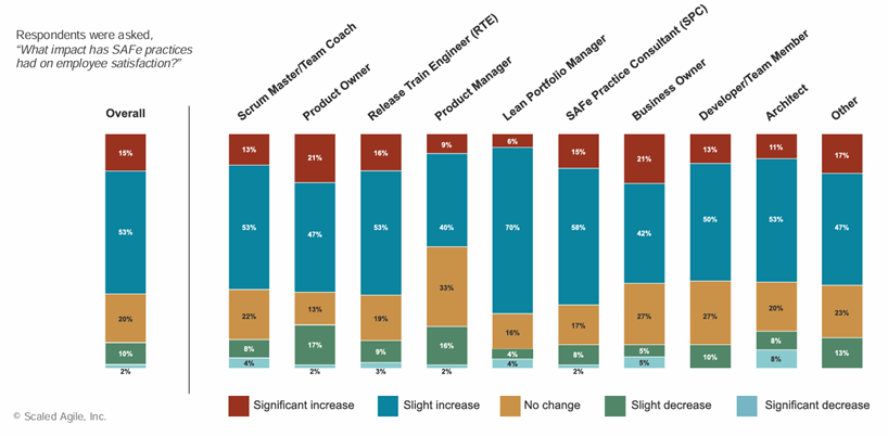 - 68%的受访者报告,由于组织实施了SAFe,员工满意度有明显或一定程度的提升。