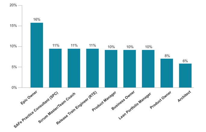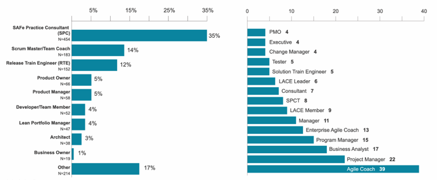 受访者被问及:“您在组织内的SAFe实施中扮演什么角色?”右侧的图表显示了“其他”回应的构成。