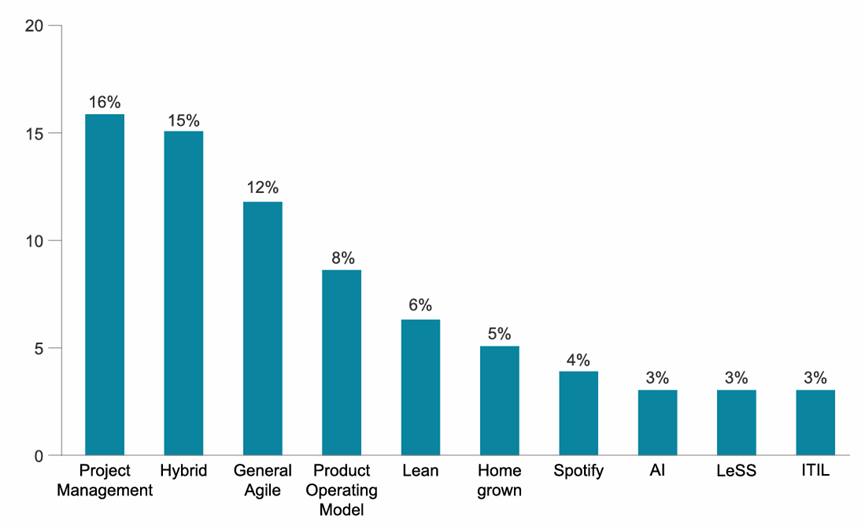 组织正在融合多种方法,包括 SAFe、产品运营模型和基于流程的工作方式。