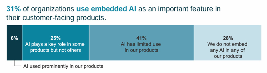 31%的组织在其面向客户的产品中将嵌入式AI作为一项重要功能。