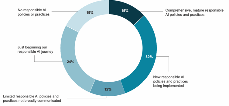 15%的受访者报告称拥有成熟且全面的负责任AI政策,而66%的受访者处于实现负责任AI的某个阶段。