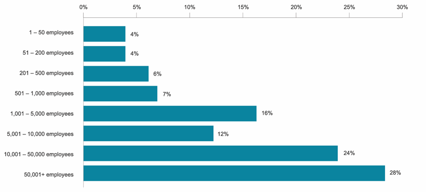 受访者被问及:“您所在公司所有办公室和/或分支机构大约有多少员工?”