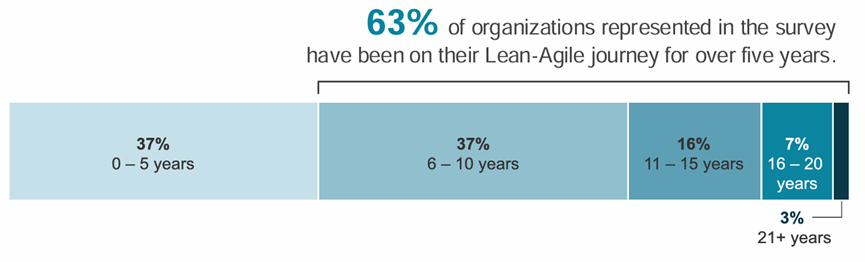 63%的受访组织在精益敏捷转型之路上已经超过5年。