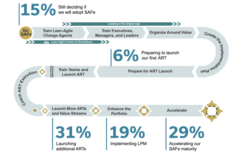 - 85%的组织已经超越已超越“采用SAFe”的决策阶段和首个敏捷发布火车(ART)的启动阶段,进入多ART扩展、投资组合管理优化及SAFe实践深化阶段。