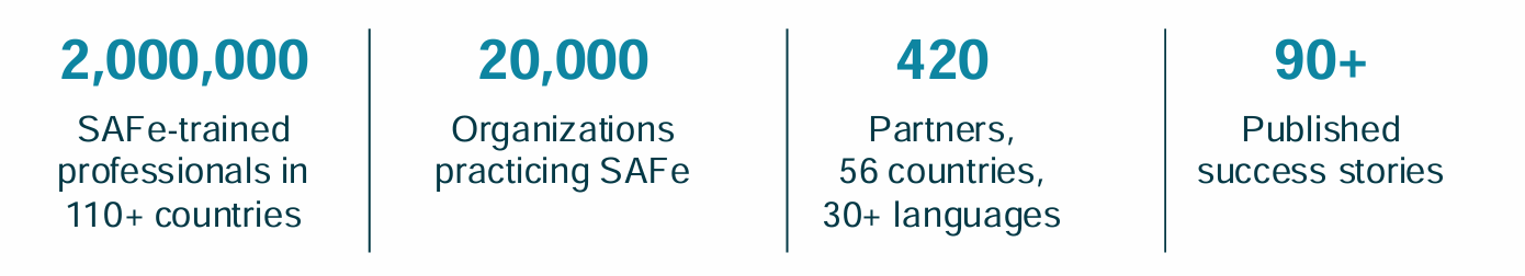 我们由衷感谢我们的受过培训的专业人士、合作伙伴和各组织,正是他们共同采用 SAFe 帮助杰出的组织打造全球最重要的产品与解决方案。