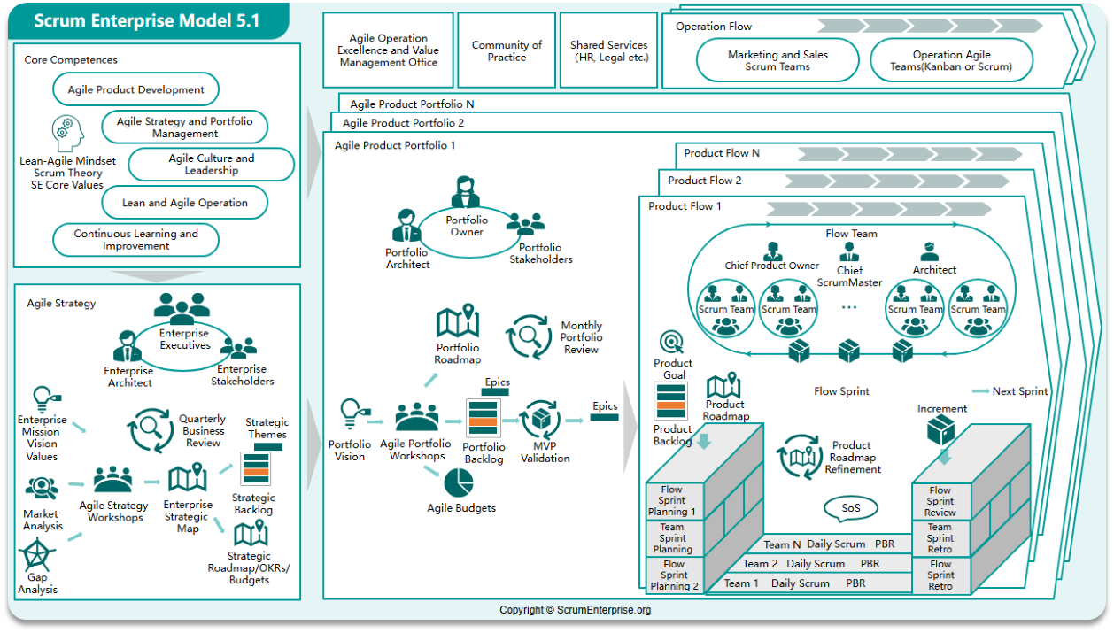 Scrum企业模型(SEM)是一个以Scrum理论、精益敏捷思想及大量成功实践基础的企业管理模型, 目标是帮助企业成为Scrum Enterprise(敏捷企业)。该模型从企业经营的视角进行设计,融合Scrum、设计思维、系统思考、精益思想、敏捷价值观和原则,敏捷战略和投资组合管理等多种思想和实践,构建出敏捷企业的整体模型。SEM的官方机构是ScrumEnterprise.org(SEO),它由企业敏捷领域的先驱及专家于2018年共同创立,是全球首家专注于企业敏捷管理模型标准的权威机构。SEO并非咨询公司,而是一家致力于开发、维护与推广Scrum企业模型(SEM)的专业组织。SEM是一个开放、供应商中立的企业管理模型,以Scrum理论、精益敏捷思想及大量成功实践基础,旨在打造高效、创新和应变的Scrum Enterprise(敏捷企业)。