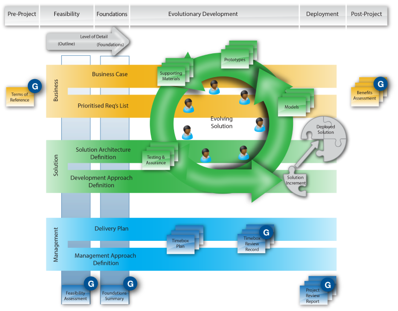 开发和交付的DSDM方法都是迭代的和增量的,最重要的业务需求通常在早期得到解决,而不太重要的功能则在稍后交付。DSDM的迭代性质使业务代表能够在解决方案的演进过程中就能看到解决方案,并基于此提供反馈,使其可以在整个解决方案的开发过程中请求变更。与大多数敏捷方法不同,DSDM将项目管理和产品开发集成到一个过程中。