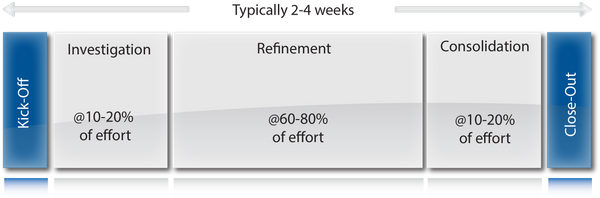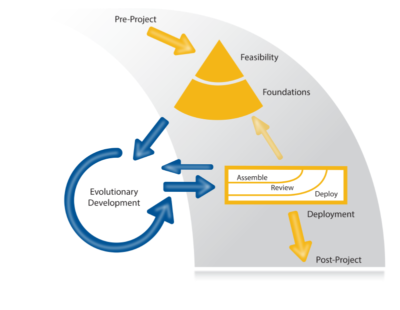 项目在此阶段被进一步推进,旨在从顶层视角理解业务的初衷、形成项目的潜在解决方案并对如何开发和交付解决方案进行初步管理。在此阶段要避免过于追求大而全,下沉到底层细节中,即便是大型复杂项目也要确保这个阶段在几周内就可以结束。和需求细节相关以及如何该解决方案这类工作是在迭代开发阶段才进行处理。