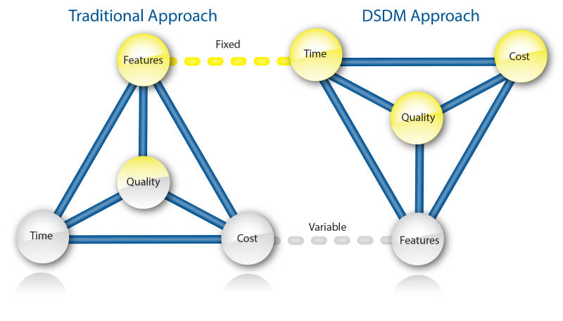 在传统的管理项目方法中范围是固定的,而时间和成本可能会发生变化。如果项目偏离轨道,通常会增加更多的资源(这会改变成本)和/或延长交付日期(这会影响时间)。然而,为进度落后的项目添加资源往往会使项目交付更慢而且拉高了项目成本,并且从业务角度看,错过最后交付期限可能是灾难性的,而且往往会损害多方的信任度。在多重压力下,还可能未经深思熟虑地进行妥协妥协,比如减少了必要的质量控制步骤或减少了测试,质量也会成为一个变量。