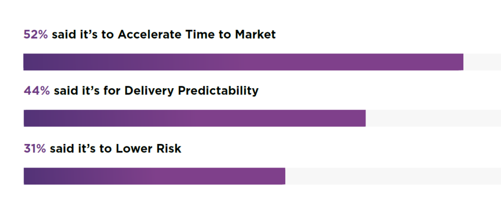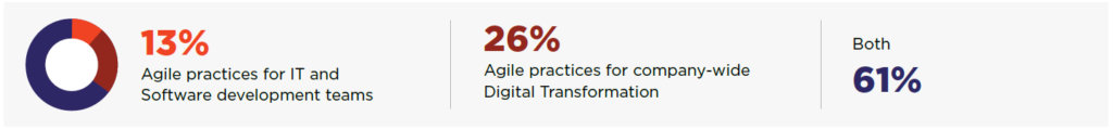 The purpose of implementing agile is not just for IT software development. 61% of respondents indicated that enterprise-wide digital transformation and IT software delivery are common goals.