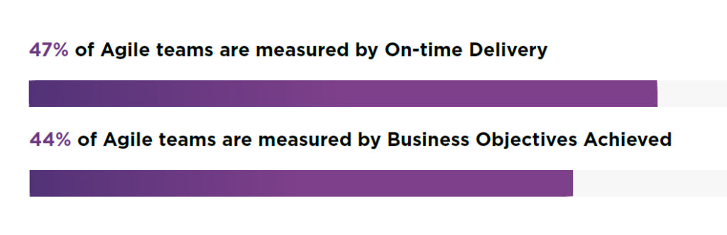 The key indicator for measuring the success of an agile team is not just on-time delivery. 44% of respondents said that the success of an agile team is measured by whether they achieve business goals.