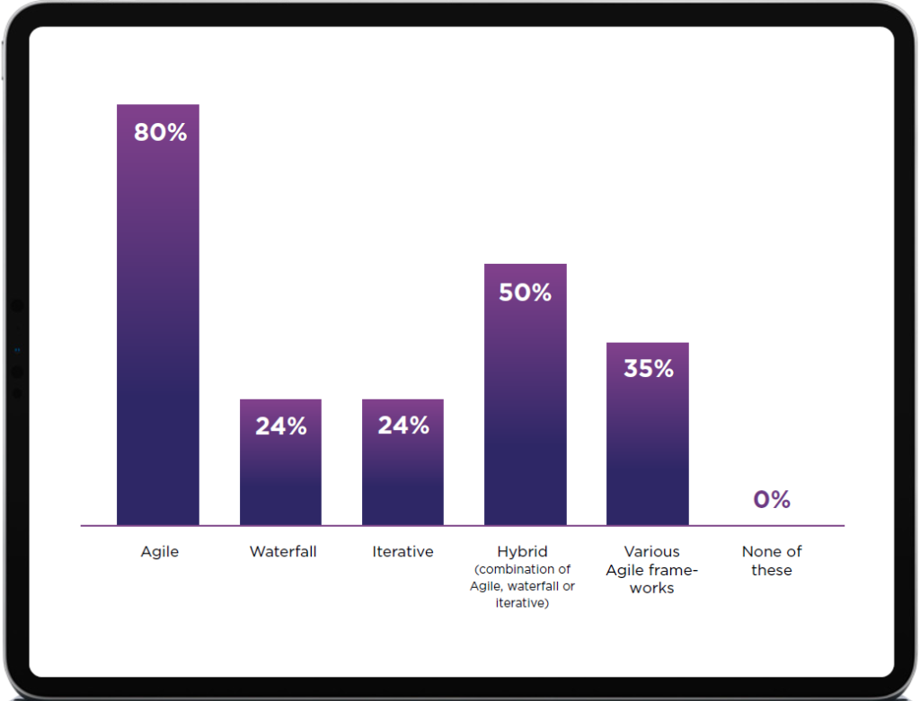 Eighty percent of respondents said their organizations were using agile, and 50 percent were using a mix of agile and waterfall or iterative development methods.