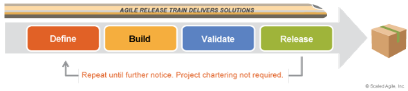 Agile Release Trains align teams to a shared business and technology mission. Each is a virtual organization (typically 50 – 125 people) that plans, commits, develops, and deploys together. ARTs are organized around the Enterprise’s significant Development Value Streams and exist solely to realize the promise of that value by building Solutions that deliver benefit to the end-user. ARTs are cross-functional and have all the capabilities—software, hardware, firmware, and other—needed to define, implement, test, deploy, release, and where applicable, operate solutions. An ART delivers a continuous flow of value, as shown in Figure 1.