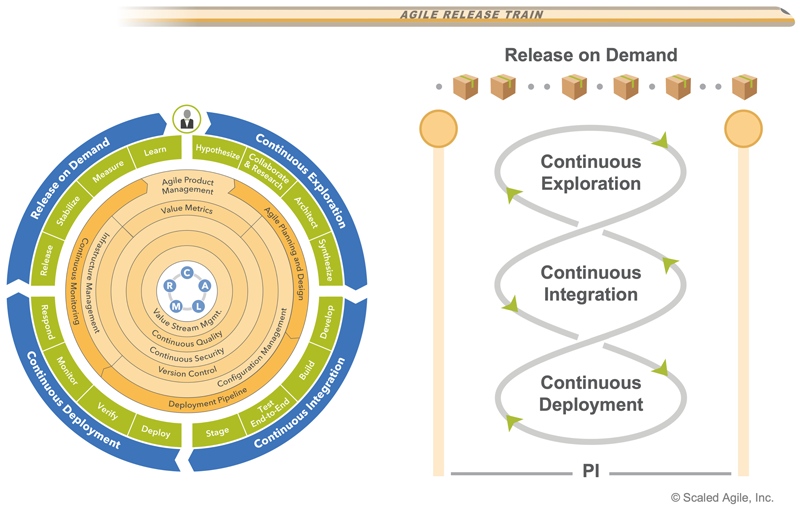 Inspect and Adapt (I&A) – An I&A event is held at the end of every PI. The current state of the solution is demonstrated and evaluated. Teams and management then identify improvement backlog items via a structured, problem-solving workshop. - Develop on Cadence, Release on Demand – ARTs apply cadence and synchronization to help manage the inherent variability of research and development. However, releasing is typically decoupled from the development cadence. ARTs can release a solution, or elements of a solution, at any time, subject to governance and release criteria.