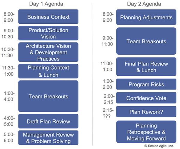 The event follows an agenda similar to Figure 2. Descriptions of each item follow. For guidance on adapting this agenda to support planning across multiple time zones, refer to the advanced topic article, Distributed PI Planning with SAFe.