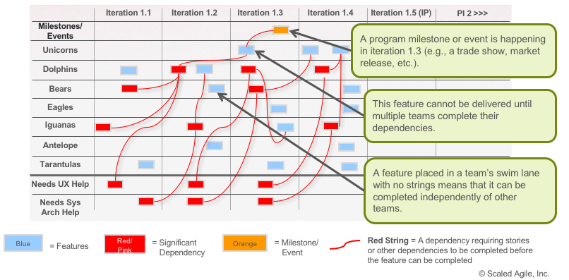During this process, teams identify risks and dependencies and draft their initial team PI objectives. The PI objectives typically include ‘uncommitted objectives,’ which are goals built into the plan (e.g., stories that have been defined and included for these objectives), but are not committed to by the team because of too many unknowns or risks. Uncommitted objectives are not extra things to do in case there is time. Instead, they increase the reliability of the plan and give management an early warning of goals that the ART may not be able to deliver. The teams also add the features and associated dependencies to the program board, as shown in Figure 3.