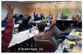 Each team conducts a ‘fist of five’ vote. If the average is three fingers or above, then management should accept the commitment. If it’s less than three, the team reworks the plan. Any person voting two fingers or fewer should be given an opportunity to voice their concerns. This might add to the list of risks, require some re-planning, or simply be informative. Once each team has voted the process is repeated for the entire ART with everyone expressing their confidence in the collective plan, as illustrated in Figure 5.