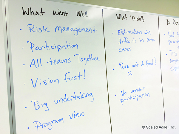- Planning retrospective and moving forward – Finally, the RTE leads a brief retrospective for the PI planning event to capture what went well, what didn’t, and what can be done better next time, as shown in Figure 6.