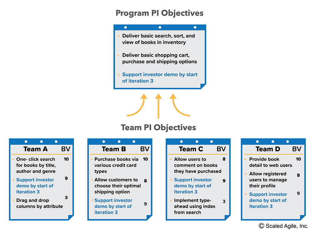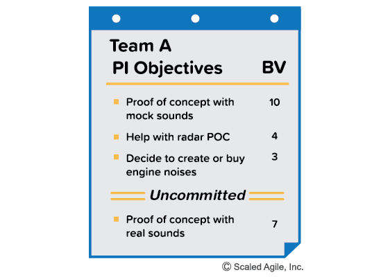- Committed PI objectives – A set of SMART objectives that are created by each team with the business value assigned by the Business Owners.