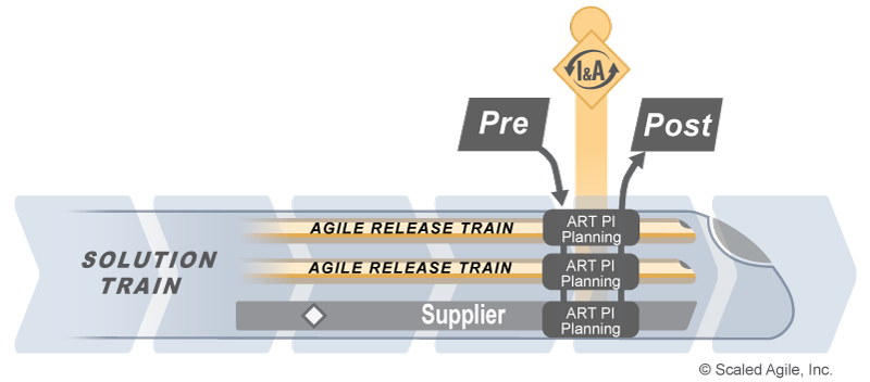 This article focuses on the planning activities of a single ART. However, large Value Streams may contain multiple ARTs and suppliers. In this case, the Solution Train provides coordination using a Pre-PI Planning event, which sets the context and provides the inputs for the individual ART PI planning events. A Post-PI Planning event follows ART PI planning and is used to integrate the planning results of the ARTs that contribute to the solution.
